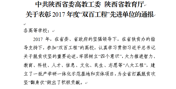 近日,省委高教工委、省教育厅印发《中共陕西省委高教工委 陕西省教育厅关于表彰2017年度“双百工程”先进单位的通报》(陕高教扶〔2018〕13号),公布了全省参加“双百工程”的103所高校的考核结果,我院获评2017年度“双百工程”先进单位称号。