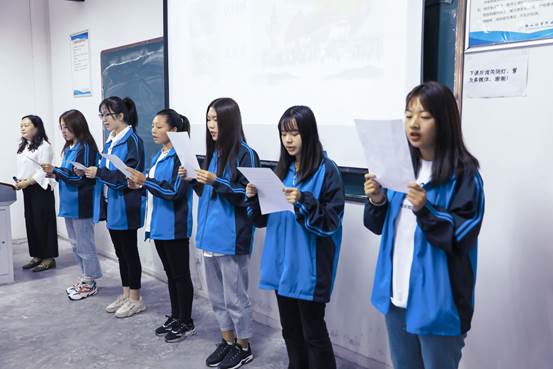 在随后的课堂互动环节“祖国我想对您说”环节中,同学们拿起手机发弹幕,大屏幕上展示出同学们对祖国的深情告白,医美1905班的刘琪媛同学通过讲述港珠澳大桥的建设成就点赞祖国,医美1905、1906班的张超、吕彤等六位学生代表走上讲台,以《少年强,则国强》为题进行了诗朗诵,铿锵有力、慷慨激昂的朗诵将同学们的爱国热情推向了高潮,最后在同学们的歌声中结束了本次授课。
