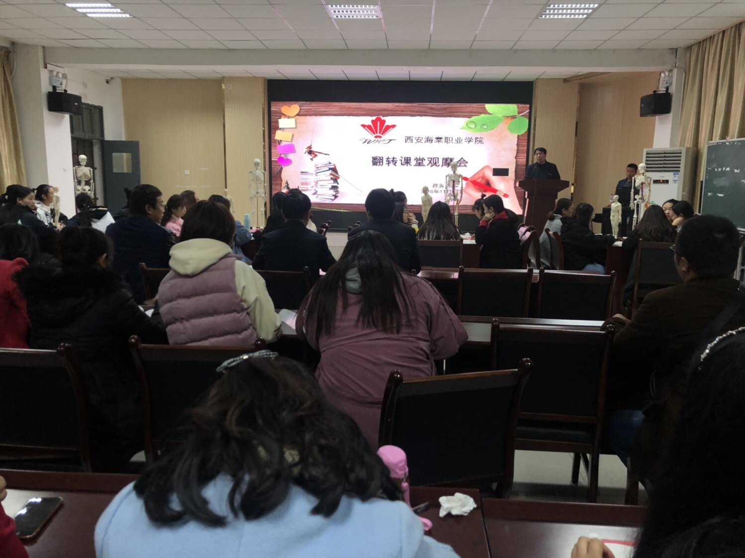 为了推进我院教学技术手段改革,2018年11月8日下午16:10分,由教务处主办的2018年翻转课堂观摩会在学院教师发展中心举行。