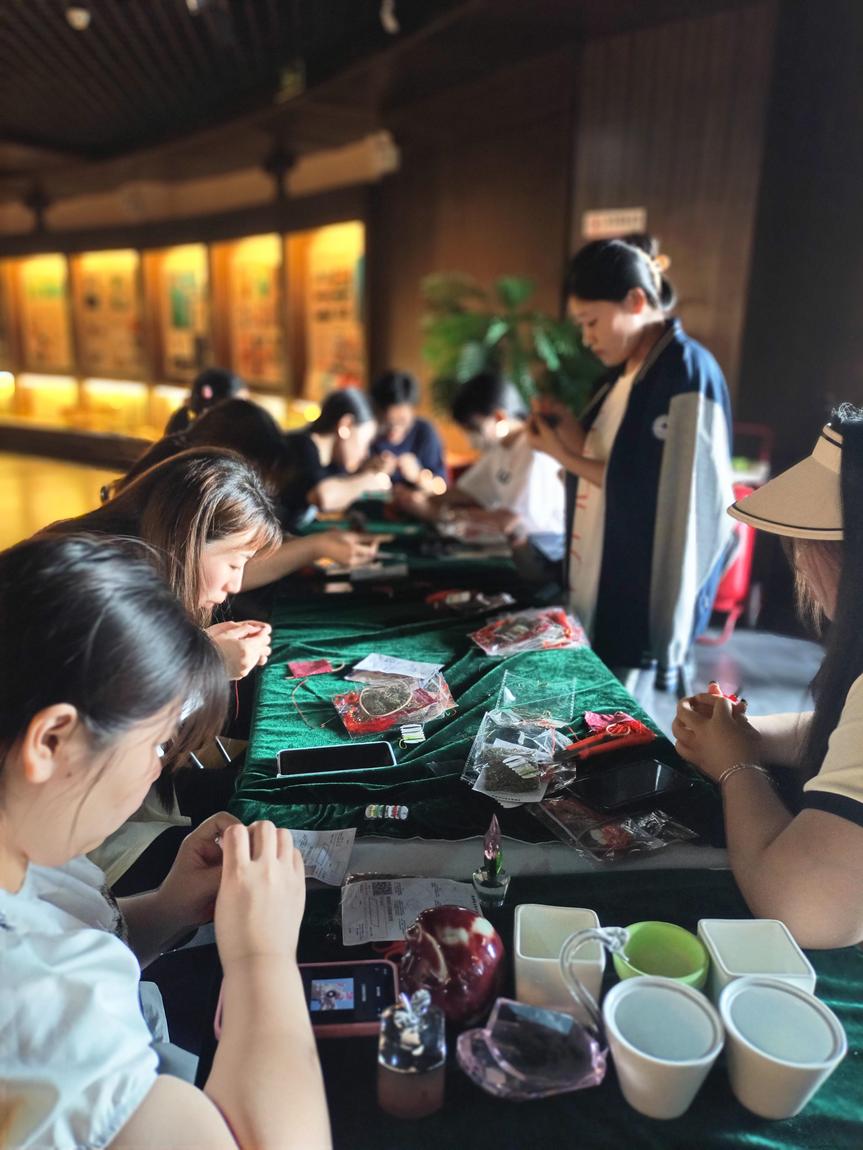 古人把香囊称之为“容臭”,俗称“香袋”,作为清香驱虫的物品使用。《礼记.内则》:“男女未冠笄者,鸡初鸣,咸盥漱……皆佩容臭”。香袋多以色彩鲜明的丝织物缝制,在其中常会填充一些具有芳香避秽的功能的中药香料。因香袋具有驱赶蛇虫的功能,便寓意端午佩戴香袋可驱除邪祟、祈福防病。本次端午节活动游客纷纷动起手来自己制作各种不同样式的香袋,让一个个寓意美好的香袋变得更加有意义。