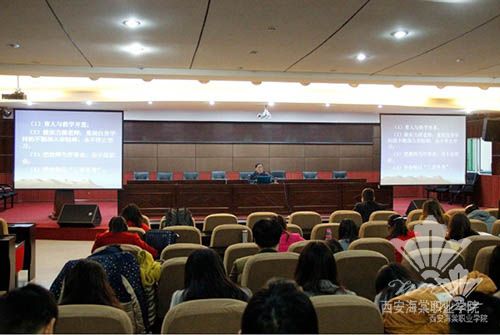 他主要从教师应具有的言行举止、德行品质入手,阐述了两方面内容:第一,从“学高为师,身正为范”的角度阐述了一位合格的好教师应具备高深的学问、渊博的知识和不断学习的精神,告诉教师只有不断提升自身业务素质和水平,才能让自己终身立于教师行业的不败之地。他说,要真正地爱学生,把教师作为事业而不是职业,努力成为让学生喜欢的好老师,这是一项不容易的工作,需要教师的长期坚持与努力,需要很高的思想意识来支撑。第二,根据儒家思想的重要理念“仁义礼智信”来论述一位好教师应具有的品德。他以亲身经历和体验为例,为大家生动讲述一位教师应该学会时刻反省自己的言行举止,争取做一位让学生喜欢、敬重的好教师。