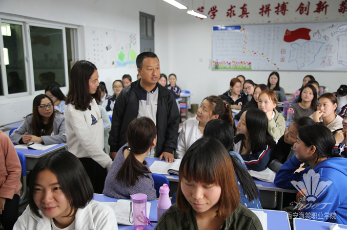 贾老师其实很忙,14级四个班、15级两个班的班导,15级年级组长,又负责医学美容学院学生党支部工作,那么多的事情围绕在他周围,但他会尽可能抽出时间到教室看一看,给学生开班会。他喜欢喊学生为孩子,喜欢开玩笑,“孩子们,你们回家的时候注意安全,有事给男朋友打电话,一定随叫随到。”当然男朋友说的就是他了。“以快乐助成长”是他一贯坚持的做法。