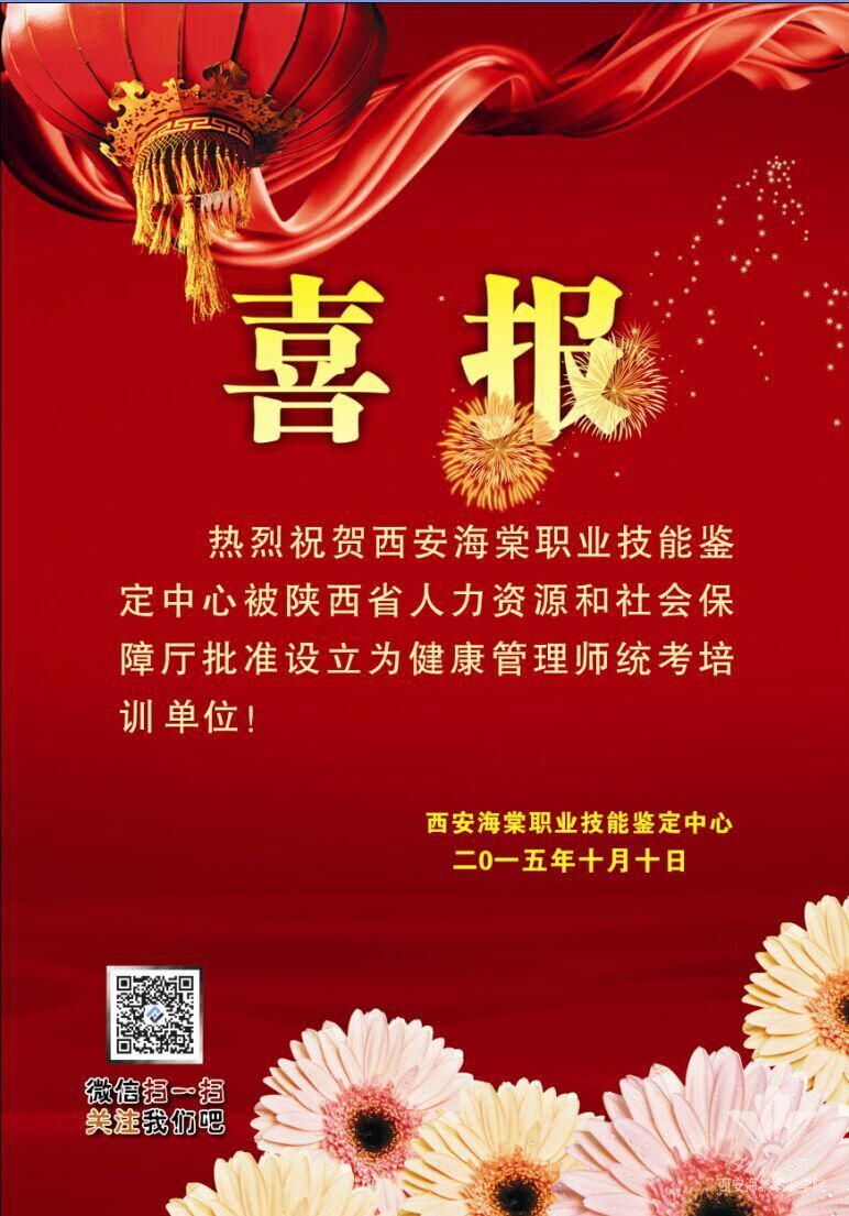 日前,从陕西省职业技能鉴定指导中心传来喜讯,西安海棠职业技能鉴定中心被陕西省人力资源和社会保障厅批准设立为健康管理师统考培训单位。