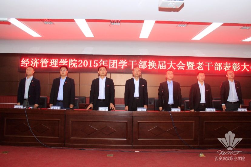 伴随着庄严的《国歌》,换届大会拉开了序幕。大会由石博书记宣读了禹龙宣等25名新一届团学干部的任职文件,并由马相臣院长和石博书记向李永成等27名老干部颁发证书。新当选的学生干部代表杨彬同志作了表态发言。他表态新一届的学生干部们会继续发扬经济管理学院学生干部的优良传统,明确职责、履行岗位职责、开拓进取、再创佳绩,正确处理好学习与工作的关系,在原有的基础上更进一步,通过开展丰富多彩的校园文化活动,全力服务青年学生成长成才。接着全体团学干部重温入团誓词并奏唱团歌!