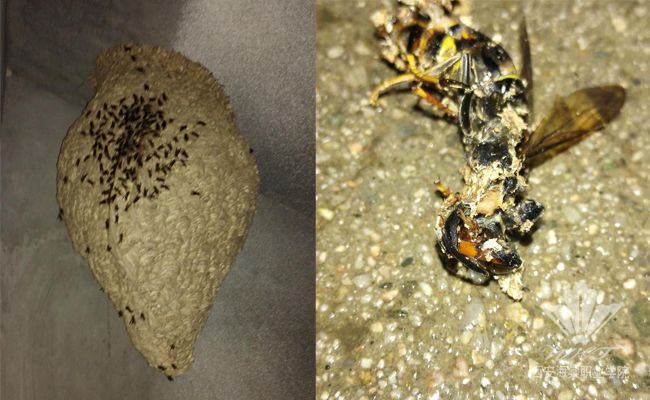 9月17日凌晨01:00整,冒着细雨,王卓理事长带领董艳金、陈金峰、汪武等安保人员,换好防化服携带照明工具、防火铲、折叠梯、专用布袋、杀虫剂登上传达室顶层,另有三名学院消防队队员驾驶消防车待命,随时准备用水雾支持突击队员,以防不测。随着理事长一声令下,分队长董艳金精准的用消防铲将巨大的蜂巢铲下,落入专用布袋中,陈金峰同志和申楚彤同志立即将带口扎牢。此时一部分漏网的胡蜂飞出乱窜,汪武和刘雨立即喷洒杀虫剂,迅速杀灭这些漏网之鱼。接下来大家用铁锨拍打布袋、脚踩等方式将布袋内蜂巢里的胡蜂全部拍死,打开布袋检查,打死的胡蜂有上万只,最大的体长4~5公分。据悉,此次剿灭的胡蜂,又叫金环胡蜂,是世界上最大的胡蜂,也是攻击性极强的危险性蜂类,此蜂毒性很强,被蜇三下以上,就会危及生命。这么大的蜂巢在国内处理过的胡蜂巢中也属罕见。