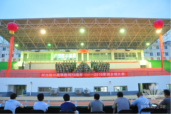 9月2日下午,2000多名新生与教官、指导员在足球场进行爱国歌曲合唱比赛。出席本次活动的领导有:学院副院长、军训总指挥、2015军训团政委吕博,军训团副团长张有斌。赵刚、朱凤林、康有为等老师担任比赛评委。