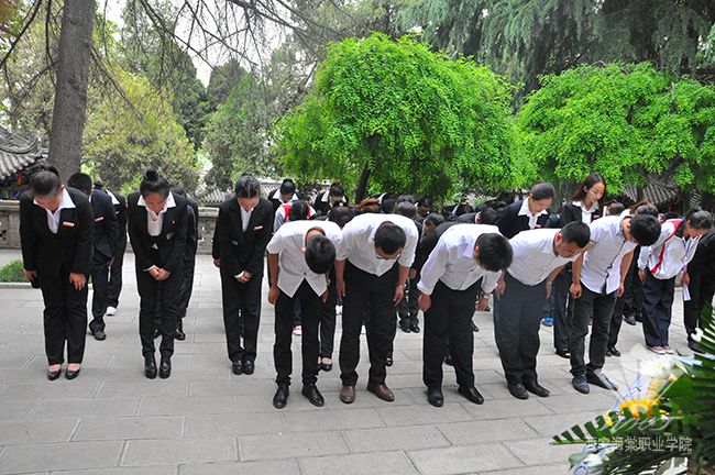 接着,党委副书记、副院长吕博和院团委书记石博代表西安海棠学院敬献花篮。参加活动的所有人员向杨虎城烈士三鞠躬,表达对革命先烈的敬仰。中医美容学院团总支部书记康有为带领所有人员进行宣誓。