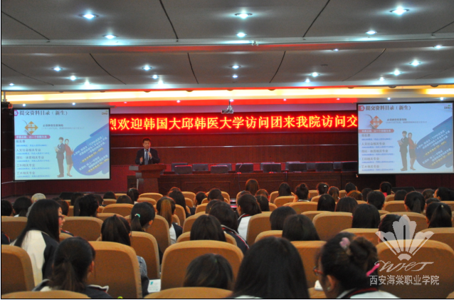 随后,西安海棠学院相关领导和韩国大邱韩医大学国际教育交流中心代表团在学术报告厅举行了本次交流访问报告会,就入学申请指南、奖学金制度、学校宿舍情况和韩语课程向中医美容学院的同学们做了精彩介绍。