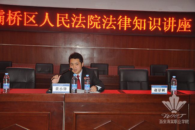 灞桥区人民法院法官黄小锋作法律讲课。他用真实生动的诈骗、抢劫、斗殴等案例,为同学们详细讲解了遇到危难时如何自保,如何用法律武器来保护自己的合法权益,学生认真仔细的听讲,时不时的用笔记录重点。讲座过程中,黄法官还与同学们进行了互动,将气氛推向高潮,用这种方式让学生更深刻的了解法律知识。
