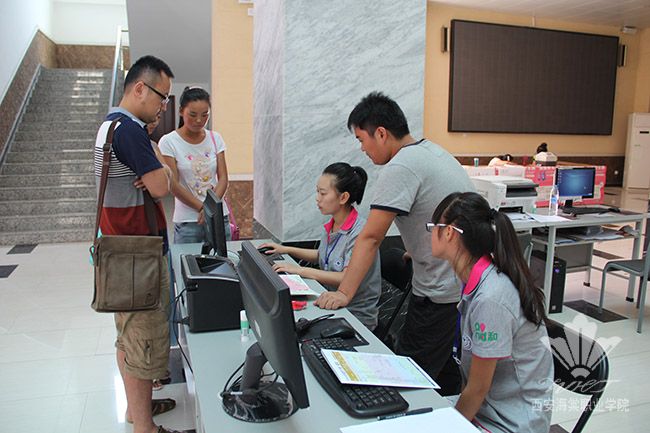 上午9时许,学院迎来了第一批新生,志愿者帮她们安置好行李后,让学生家长在招办大厅内稍作休息后,帮助新生和家长进行报到验证、缴费、电子注册、军训分配、宿舍分配、物品发放等一些列报到流程。在路上,志愿者为2014级新生讲解了入校后的注意事项,提醒学生军训的时候天气炎热,要常备降暑药品,一路说着把她送入宿舍,学生家长连连称赞志愿者服务态度周到。