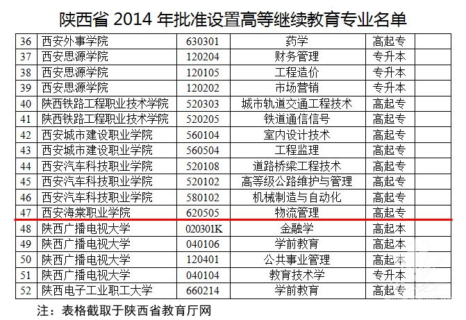 日前,陕西省教育厅公布了高校2014年新增高等继续教育专业审批结果,海棠职业学院 2014年申报的物流管理专业已通过教育厅审批,将于2014年秋季正式开始招生。