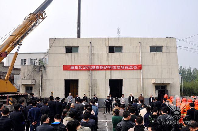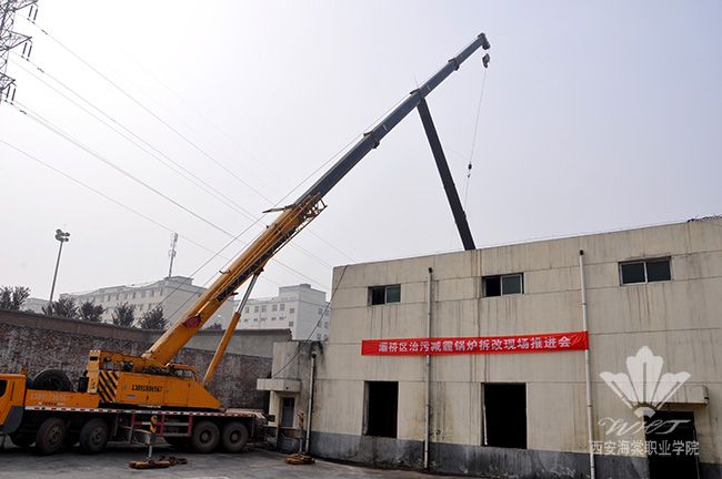 4月24日上午,在SUNBET申搏举行的灞桥区燃煤锅炉拆改推进会的现场,灞桥区副区长杨爱民宣布“灞桥区第一批燃煤锅炉拆改工作正式启动”的话音刚落,在吊车的牵引下,海棠职业学院燃煤锅炉的烟囱缓缓落下,这是灞桥区燃煤锅炉拆改推进会现场最激动人心的一幕。出席本次推进会的领导有西安市环保局副局长颜昊,灞桥区副区长杨爱民,市环保局宣教处王涛,灞桥分局局长蒋涛,纺织城、狄寨街办副主任陶永宏,职院院长冯居秦、副院长赵景利。各街办环保专干、校内相关处室工作人员也到场参会。西安电视台等媒体对活动进行采访报道。