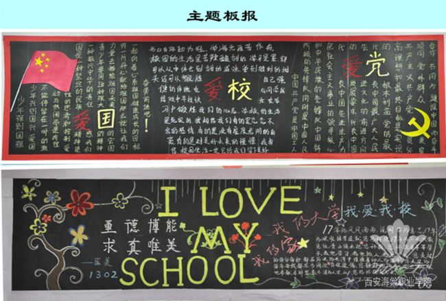除此之外,各二级学院通过主题班会、宣传展板、简报,广泛宣传社会主义核心价值观,引导学生立足自身,以认真学习、做文明大学生的实际行动践行核心价值观。中医美容学院开展了“爱国、爱党、爱校,传播正能量”主题黑板报大赛,各年级学生充分发挥自己的聪明才智,用深情的文字、多彩的绘画书写了自己对国家、党和校园的热爱之情。