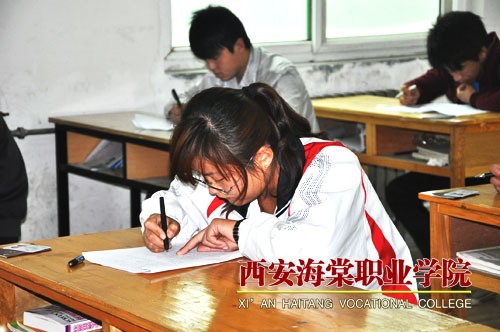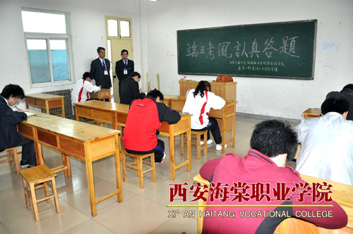 10月10日,西安海棠学院管理学院组织对9名建筑管理专业学生进行补考。窗明几净的考场,黑板上用彩色粉笔写着“端正考风认真答题”几个大字,一张张桌子的右上方整齐摆放着考生的身份证、学生证,同学们一丝不苟地答题。两名胸前挂着监考工作牌的老师认真监考,学院考试中心巡考人员不时进入考场巡考。一个半小时的考试时间里,考场秩序井然。