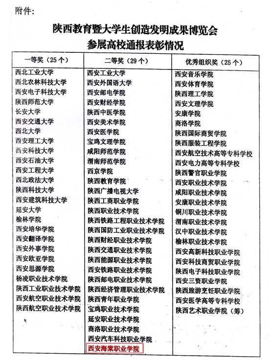 本次博览会的筹备工作时间紧、任务重、要求高,面临许多困难和问题。但是,在各高校的大力支持与配合下,全省上下精诚团结、扎实工作、开拓创新、狠抓落实,以优异成绩圆满完成了各项工作任务,受到上级领导、与会嘉宾、国际友人和社会各界的广泛好评。为此,省教育厅决定对参与“陕西教育暨大学生创造发明成果博览会”的各高等学校分三个等次予以通报表彰。经认真评选,决定授予西北工业大学等25所高校一等奖,西安工业大学等29所高校二等奖,西安音乐学院等25所高校优秀组织奖(名单附后)。