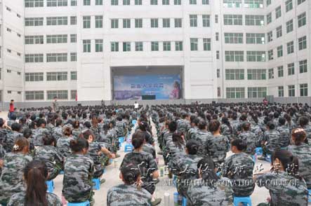 8月14日上午,在西安海棠学院3号楼风雨操场,学院军训指挥部对刚入学的新生进行了入学教育,由西安海棠技师学院办公室主任、资深安保工作者吕春稳给他们做安全教育讲座。