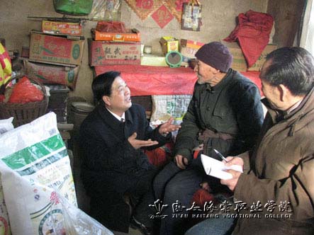 2010年12月30日下午,我院党委王爱民副书记带领党委办公室同志,代表院党委、行政,前往张李村慰问老党员、老干部张九正老人,并给他送去面粉、水果等慰问品,把海我院党政领导和全体党员、师生的温暖送到老人家中。张九正老人,今年88岁,解放初期入党,担任村干部几十年,为农村建设做出了贡献,现在他和84岁的老伴单独居住。王书记详细地询问了老人的身体情况和生活方面的困难,语重心长地嘱咐老人保重身体,欢度晚年。张九正老人十分感激,再三感谢我院党委、行政领导和全体师生的关怀。