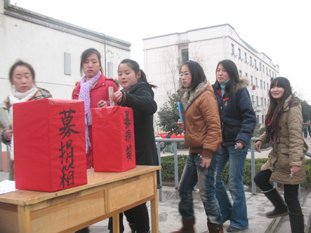 本次活动中,我院所有爱心人士伸出了援助之手。参加此次募捐活动有校学生会、团委、卓越讲师团、艺博文学社、英语俱乐部、绿色环保协会等16个社团参加。同学们纷纷解囊,将自己的爱心投入红色募捐箱。此次活动在我院引起了广泛的关注,将在我院各年级、各班进行募捐活动。