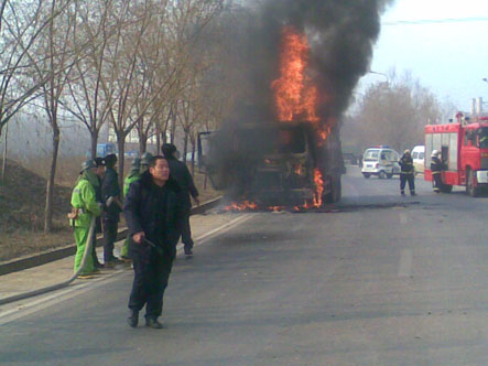 2009年12月18日中午11:30分,防火科接上级指示在学院南门外公路有一环卫车发生着火,迅速出警。在总指挥邢军处长、现场指挥张景利队长的带领下,消防队员张景顺、阴豹、徐守灿、郭鹏瑞、王小科、吴亚伟、杨帆、李印英勇奋战、争分夺秒,对火势进行扑灭,12:15分火情的到了有效控制。因抢救及时此次火灾未造成其他重大事故及人员伤亡。