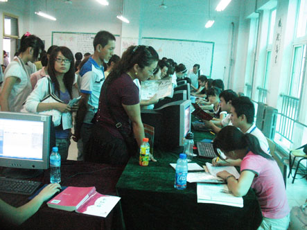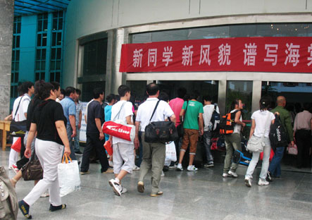 2009年8月10日上午一大早就有新生陆续来我院报到,上午十点左右我院大厅前爆满,接下来的时间我院大厅以及各报道小组处挤满了前来报到的新生及家长。