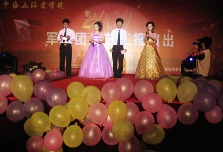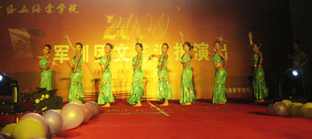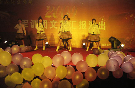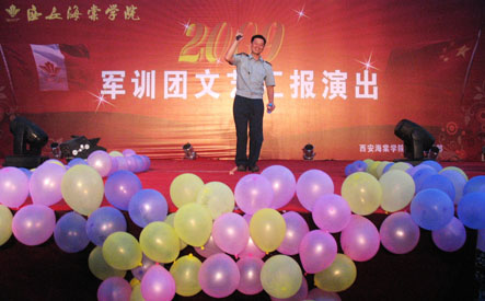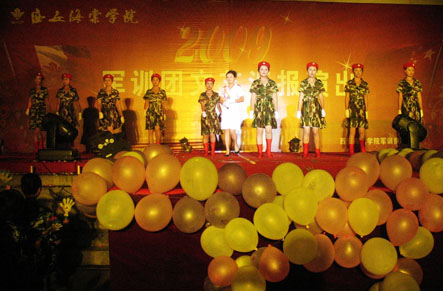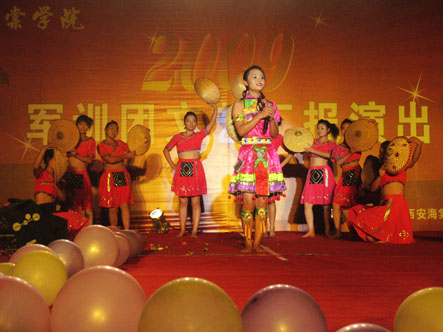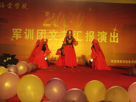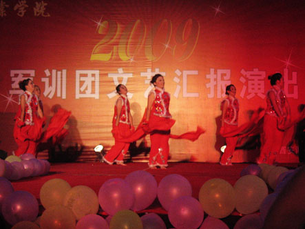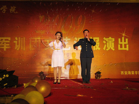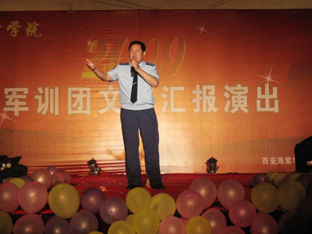 为充分展示当代大学生的人格魅力和精神面貌,用青春构建和谐,谱写美丽人生的青春章。2009年8月31日晚,我院09级新生军训团军训汇演在我院顺利举行。陕西海棠集团总经理王卓同志,我院院长冯居秦同志,军训团团长王鉄练同志,副院长兼军训团政委吕博同志,副院长蒋国瑜同志,副院长王景洪同志,院长助理赵景利同志以及学院各处室的领导出席并观看了演出。演出中各位领导对此次演出给予了高度的评价。