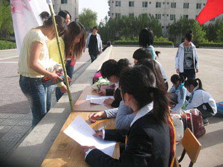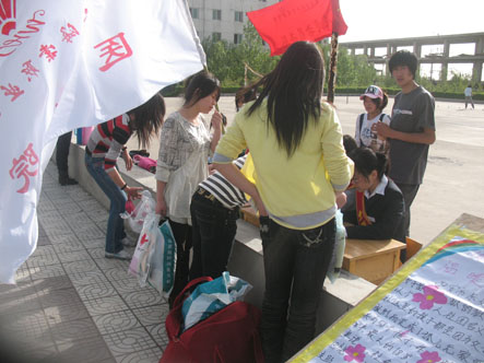 2009年4月20日下午4:00 ,我院医学院团委、学生会联合主办的以“爱心、奉献、快乐”为宗旨的爱心捐赠活动在我院排球场展开。