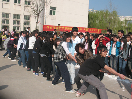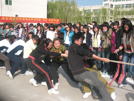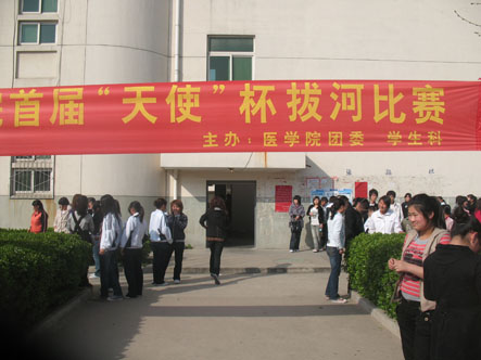 为活跃我院学生课余活动,丰富大家的业余生活。2009年3月23日下午4:00,在我院排球场举办了“西安海棠学院医学院首届‘天使’杯拔河赛”,本次比赛由医学院团委、学生科主办。医学院副院长高院长、医学院学生科巩科长亲临比赛现场,为同学们加油助威。我院记者杨佳宁跟踪采访,景盼拍摄。