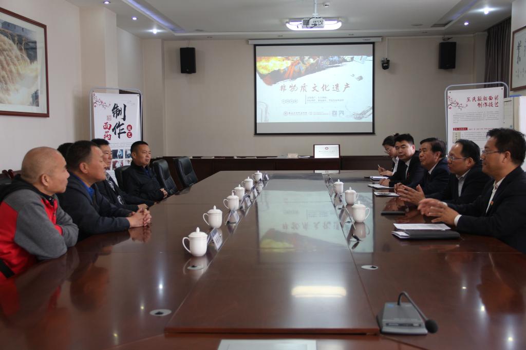 杨国峰副院长向与会人员介绍了我院非遗项目“王氏驻颜面药制作技艺”的概况及已开展的工作,并简要介绍了学院继续申报市级非遗项目的基本思路。贾处长一行对我院申遗项目的名称、方向和申报流程等事项进行了耐心细致的现场指导,对申遗办提出的问题进行了答疑解惑。