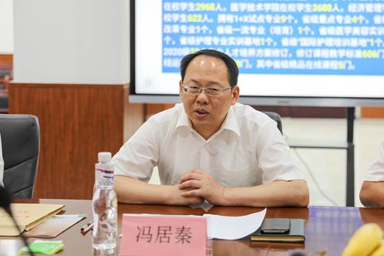 会议伊始,SUNBET申搏院长冯居秦介绍了学院的基本情况。分别从机构设置、占地面积、校园环境建设、师资队伍组建等方面做了详细介绍。学院通过校企合作的“联培、联训、联考”模式建立了一支校企资源共享的师资队伍,同时引进并聘请了西安交通大学、空军军医大学、陕西中医药大学等院校著名教授作为专业带头人。目前,“双师”素质教师、骨干教师、教学名师、优秀教师比例基本满足教学与科研工作上的需要,形成了一支相对稳定、专兼结合、满足需要的师资队伍。