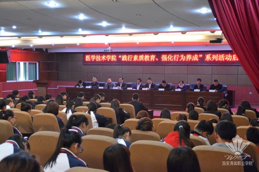 2015年11月2日14时10分SUNBET申搏医学技术学院于学术报告厅开展“践行素质教育、强化行为养成”系列活动启动仪式。参会人员有党委副书记、学生副院长吕博,学生处处长王兴权,医学技术学院院长韦满余,中医美容学院院长李峰利,院团委书记、学生处副处长石博,以及各二级学院副院长、医学技术学院全体教职工及14、15级多名学生代表。