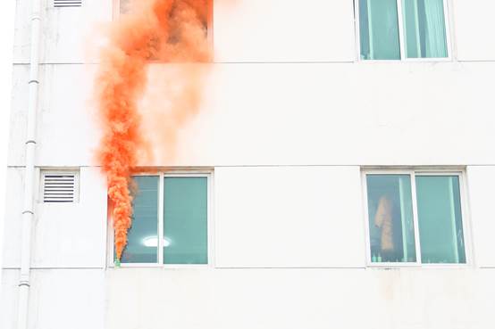 12月15日16:10,随着警报被拉响,公寓楼四楼内烟雾四起,消防演练拉开序幕。学生们捂住口鼻,弯腰疾行,在老师的组织下安全、有序、快速地到达疏散集合地,整个过程参与人员配合默契、各项流程有条不紊。消防员第一时间到达区域开展灭火战斗。