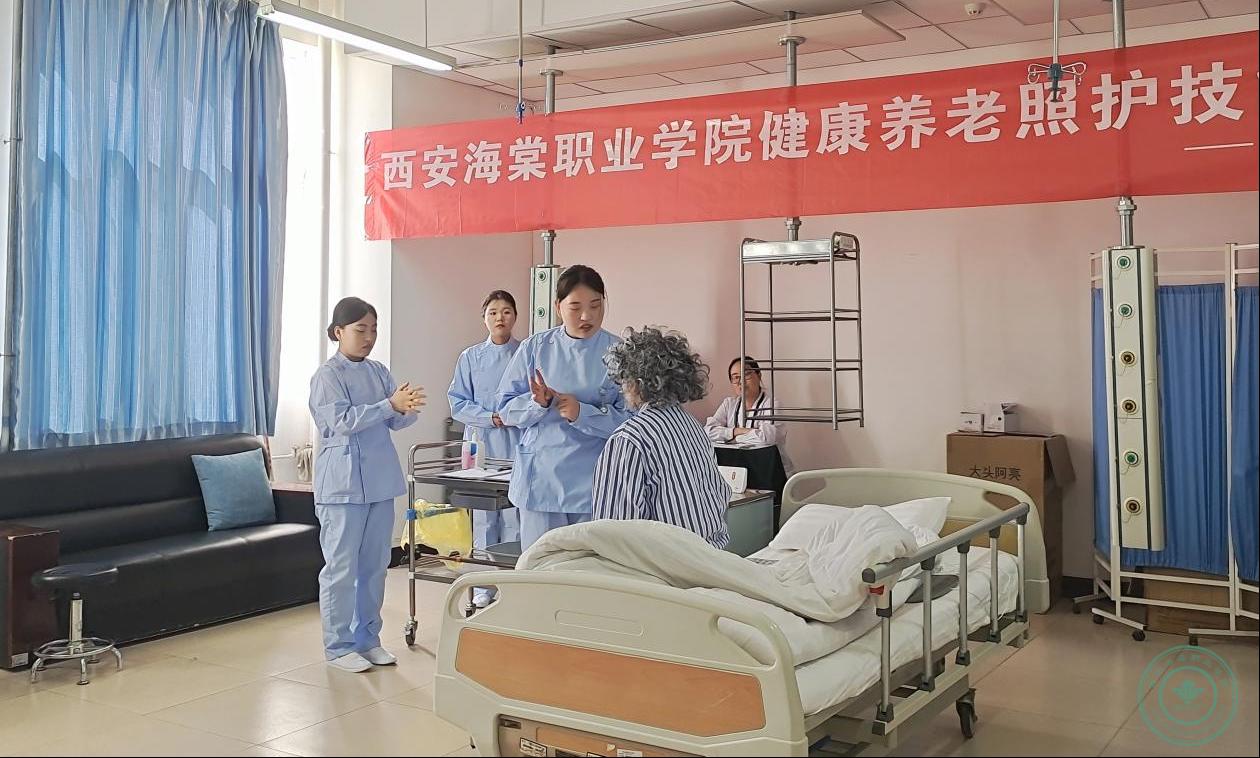 随后,杨院长一行来到健康养老照护技能大赛培训室。在这里,选手们不仅展示了专业的照护技术,更通过细致入微的服务和温暖的人文关怀,彰显了医学技术系在健康养老领域的教学特色。