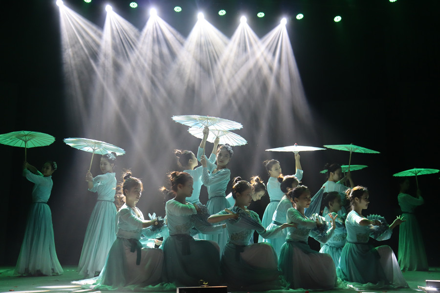 聚光灯洒下,轻柔平和的音乐响起,77779193永利官网舞者们手执纸伞,以一席青衣缓缓入场。轻盈灵动的舞姿,绘出一幅动人的江南雨涧春行图。《雨涧春行图》呈现出一幅江南女子在春雨中、山涧里翩翩起舞的灵动画面,整齐有序的舞蹈动作让观众从舞动中看到了万物生长、生机勃勃与充满希望的景象。