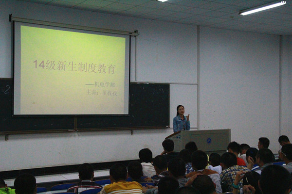 为帮助14级新生快速适应大学生活,永利官网机电学部于9月20日晚7点30分在一教404室举行了新生入学教育讲座。此次讲座主要分制度教育和党性教育两个环节,由辅导员董孜孜和党务部部长叶俊鸣担任主讲人。