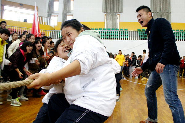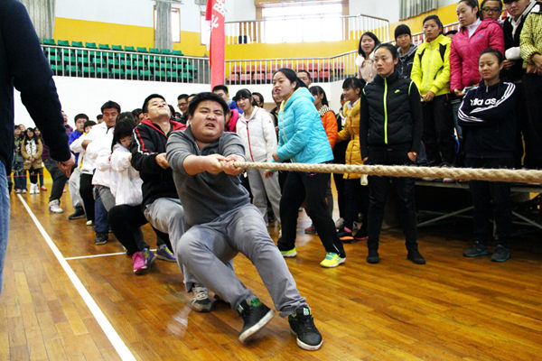 下午2点,前四名角逐赛正式开始,由于上午永利官网队伍状态良好,频频取胜,所以下午赛两只队伍只要赢取了第一场,则是第一。队员们拉筋、压腿,积极进行赛前的热身运动。第一个上场的是混合组,秘书团团长高晗打趣道:“紫胖子是混合组的压轴。”原来混合组最后一位男生身着紫衣,被大家打趣称“紫胖子”。混合组的对手是信息学院,同为强队,永利官网队员不敢有丝毫懈怠,纷纷打起了12分的精神。“一二!一二!”队伍最前方的男生在前方喊着口号,最后的男生将麻绳在手上缠了几个圈,其他队员们也死命抓着绳子不敢懈怠。随着裁判一声令下,激战开始。我方队员一脚右,一脚左。对方用力时,我方则死命防守;对方一旦松懈,我方则一鼓作气立马拔过来,第一场赢得胜利。第二场比赛中,永利官网错失良机,输给了信息学院队伍。而在第三次比赛中,永利官网队伍吸取教训,比赛一开始,立即取得先机,全部队员使尽全力,场外观众的加油声也已达炙热化。僵持了10秒左右,我方一鼓作气,赢得了比赛。而女子组在混合组胜利号角声下,连续拿下两场胜利,获得第一。