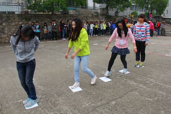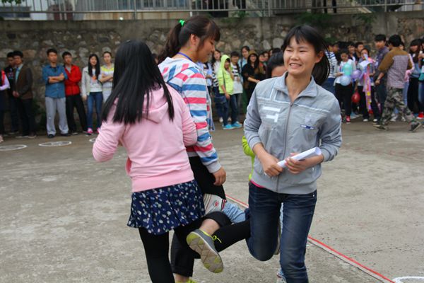 只听见“嘭”的一声,气球碎屑在空中飞扬,这就是“气球对对碰”的比赛环节,勇敢的女生们正相互用后背快速挤爆气球;“向左走,快向右走,哎,直走!”结果,瓶子还是倒了。在“仙人指路”游戏中,蒙着眼睛行走的女生不时撞倒瓶子,有些笨拙却可爱十足,不时引起观众们开怀大笑。