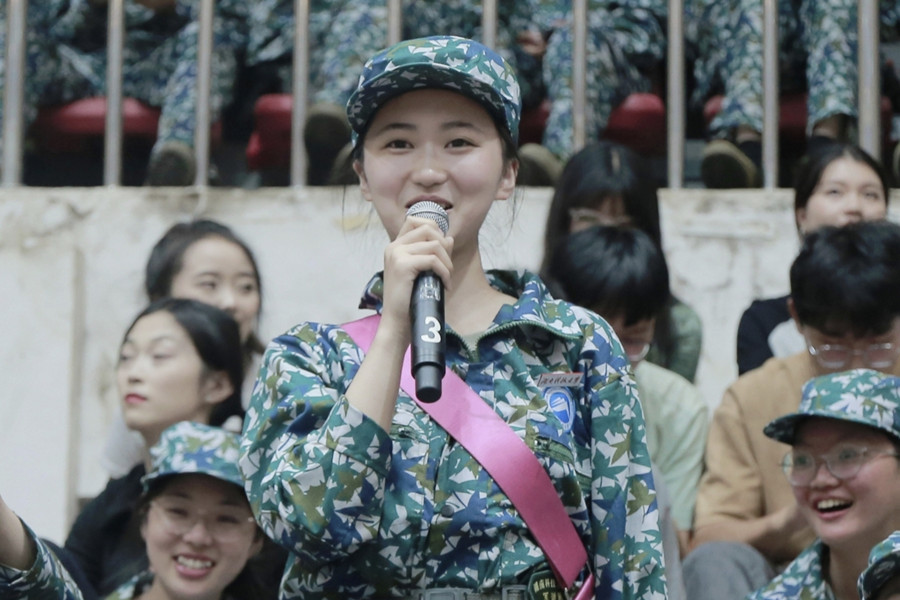 一轮精彩的表演过后,带来互动环节“爱在心间,为爱发声”。教官们褪去训练场中的严厉,对新生们表露内心真情实感,深深感动了在场观众。随后,同学们也积极回应教官的爱,“我要表白我们二十二连六排教官徐敏杰!虽然徐教官训练时十分严厉,但私底下默默带给我们许多温暖,教官您辛苦啦,我们爱您!”22级法学二班新生蒋锐激动地说道。听到新生们一句句表白的话语,教官们很是欣慰。
